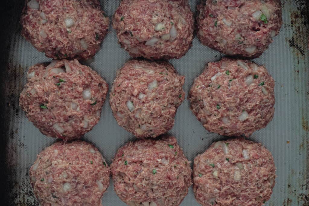 - Divide the beef mixture into 12 even portions and shape the mixture into round rissoles. Start with wetting your hands to stop the beef mixture from sticking. I kind of throw them back and forth between each hand to compress the meat and shape them into a ball. At this stage, I normally line them up on a baking tray to ensure they are all evenly sized.