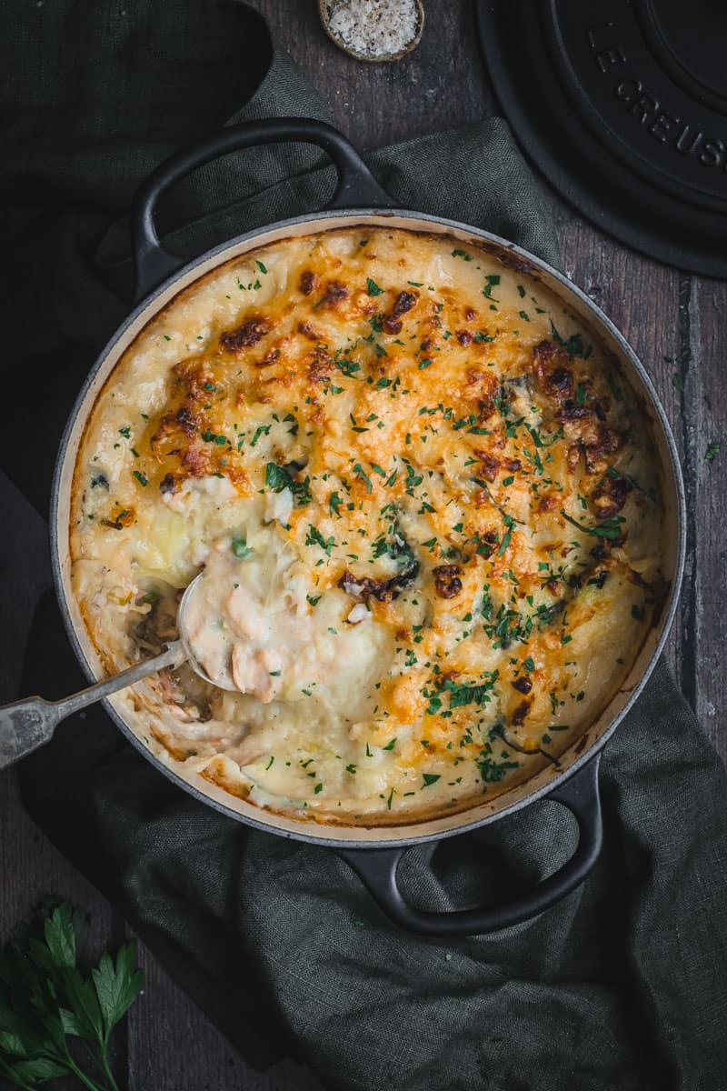 If you are filling your fish pie to the top of your baking dish, just be sure to pop a baking sheet on the rack underneath as it may bubble over.