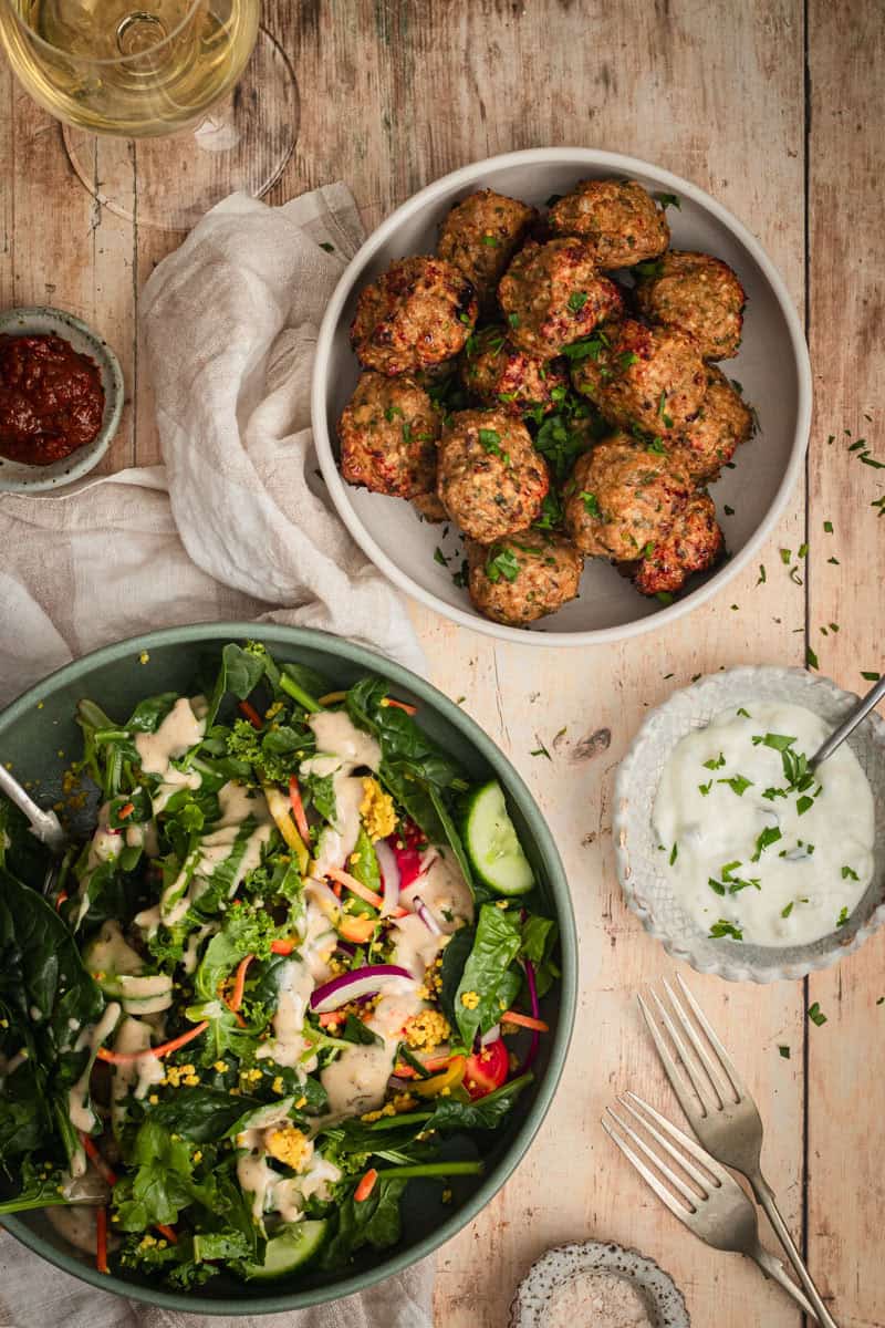 Alongside a fresh Mediterranean salad. Add some fetta, olives, and your meatballs for a delicious and healthy dinner.